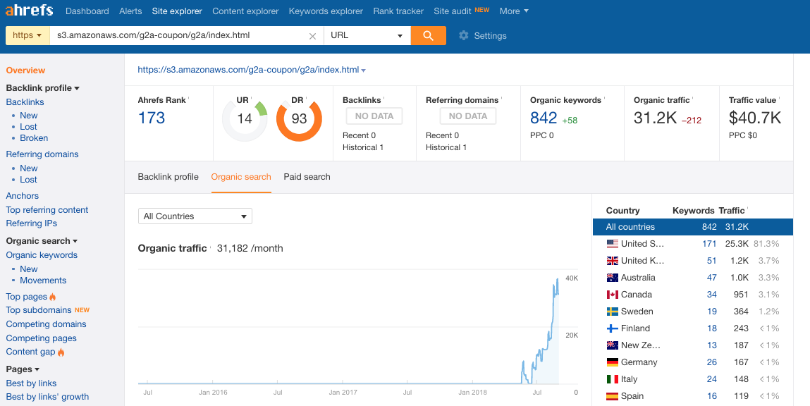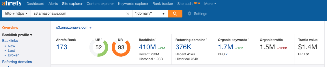Segundo a Ahrefs , o amazonaws.com possui 410 milhões de backlinks provenientes de 376 mil domínios diferentes. Essa quantidade de backlinks é impressionante, tornando-o um dos principais sites de todo o sistema Ahrefs.