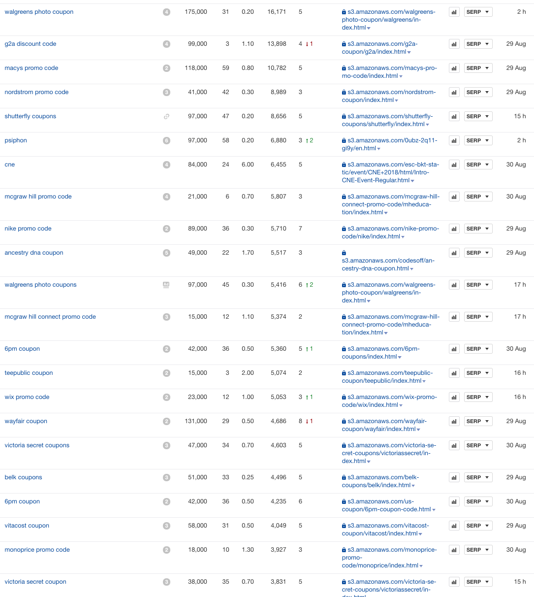 Por curiosidade, cliquei no relatório de palavras-chave do Ahrefs para ver quais arquivos do S3 estavam ranqueando para quais palavras-chave e notei que quase toda a primeira página de resultados era relacionada a códigos de cupom.